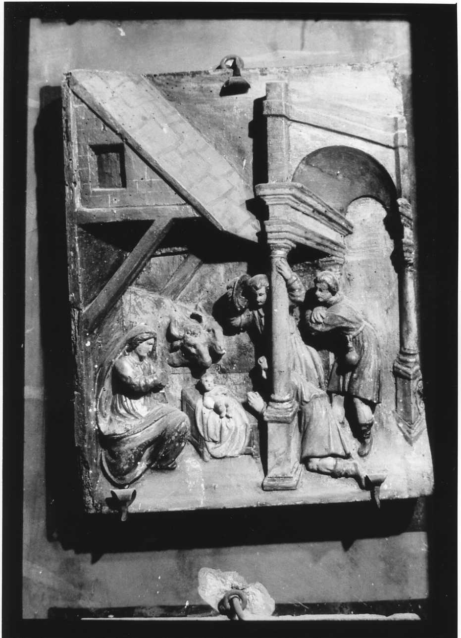 Tavoletta in legno scolpita a rilievo rappresentante l'adorazione dei pastori. Entro una mangiatoia posta sotto una costruzione in mattoni con un'incongruente ingresso ad arcata su colonne doriche, è raffigurata la Madonna sulla sinistra, il Bambino nella culla al centro con alle spalle il bue e l'asino, e i tre pastori sulla destra, con morbide vesti corte e calzari