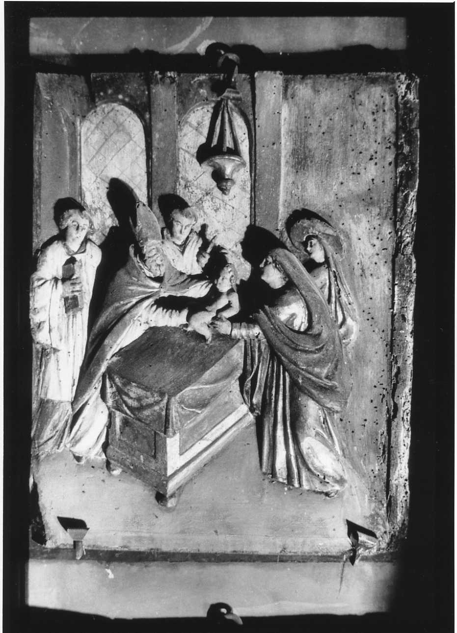 Tavoletta in legno scolpita a rilievo rappresentante la presentazione di Gesù al tempio. All'interno di una chiesa dalle alte vetrate centinate, sull'altare la Madonna porge il bambino al sacerdote accompagnato da altri due funzionari religiosi. Alla destra della Madonna c'è Sant'Anna