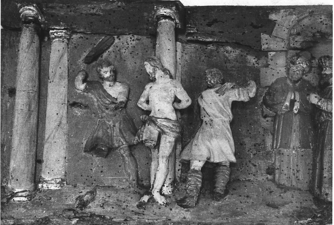 Tavoletta in legno scolpita a rilievo rappresentante la flagellazione di Cristo. Al centro della scena è raffigurato Cristo legato ad una colonna, rivestito del solo perizoma annodato. Di fianco vi sono i due soldati romani che lo colpiscono con flagelli. Sulla destra si affacciano ad assistere alla scena due sacerdoti