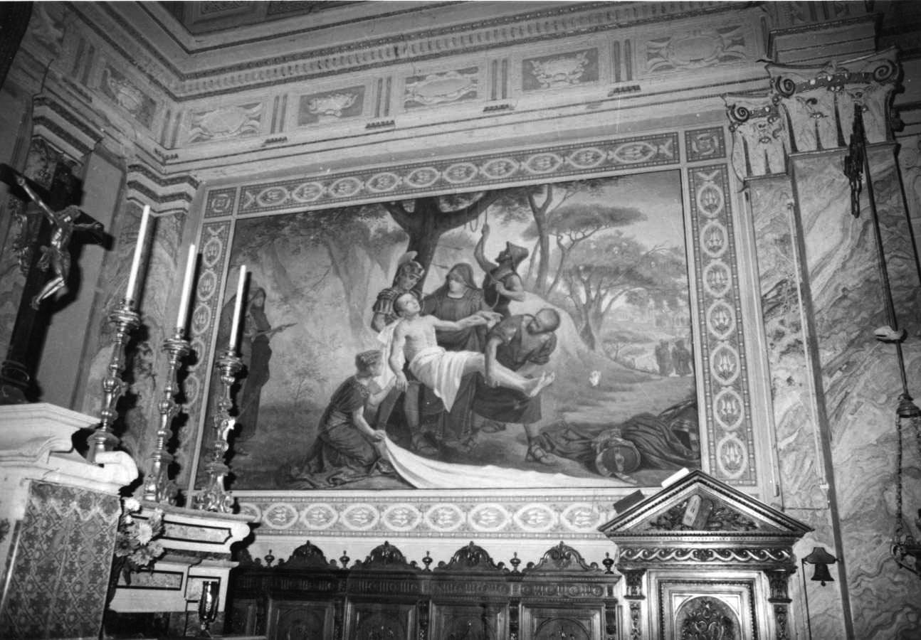 La scena, incorniciata da un fregio geometrico, è costituita dal gruppo del Santo sorretto da tre personaggi (una donna ammantata, un uomo in tunica calvo ed una fanciulla con abito lungo), in secondo piano un soldato con galea, ed il carnefice che attacca il cappio ad uno degli alberi del bosco che fa da fondale. I colori dell'opera sono intonati al pastello. Il bruno dei manti dei soccorritori, in contrasto col bianco del Santo, ben risaltano sul vago sfondo del paesaggio