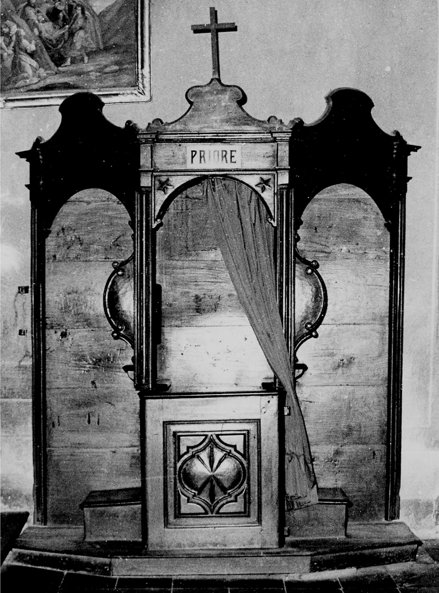 - NOTIZIE STORICO CRITICHE Il confessionale è ricordato già nell'inventario del 1680. La decorazione del pannello, seppure leggermente più semplice, è molto vicina a quelle porte della credenza acquisita dalla Soprintendenza nel 1972 e proveniente dall'Ospedale di Entraque e potrebbe essere riconducibile al medesimo ebanista (Soprintendenza alle Gallerie e alle opere d'arte del Piemonte. Recuperi e nuove acquisizioni, Torino 1975, p. 34)