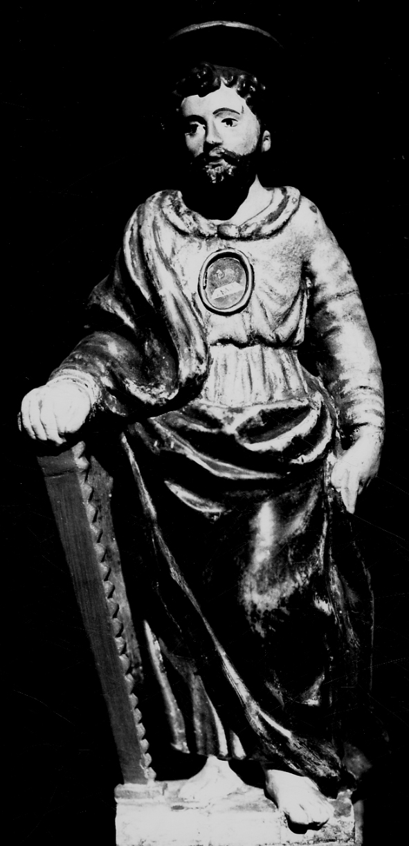 Il santo è rappresentato in piedi su un piedistallo; con la mano sinistra sostiene il lembo del mantello e con la destra si appoggia alla sega. In origine dorato, venne ridipinto