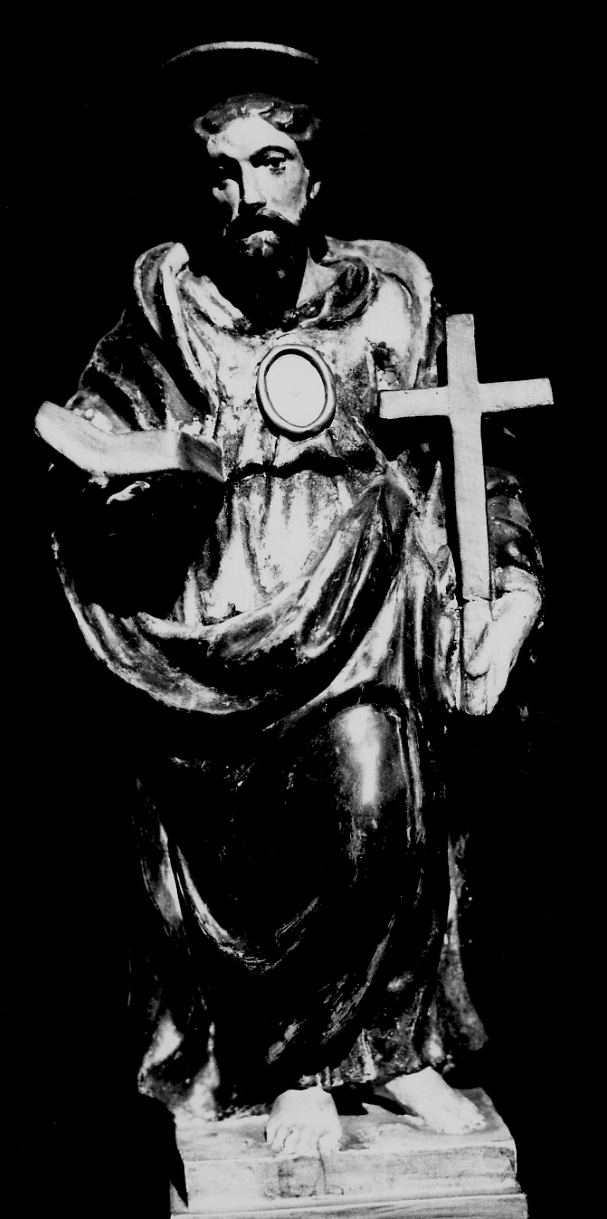 Il santo è rappresentato in piedi su un piedistallo; con un libro nella mano destra ed una croce nella sinistra. In origine dorato, venne ridipinto