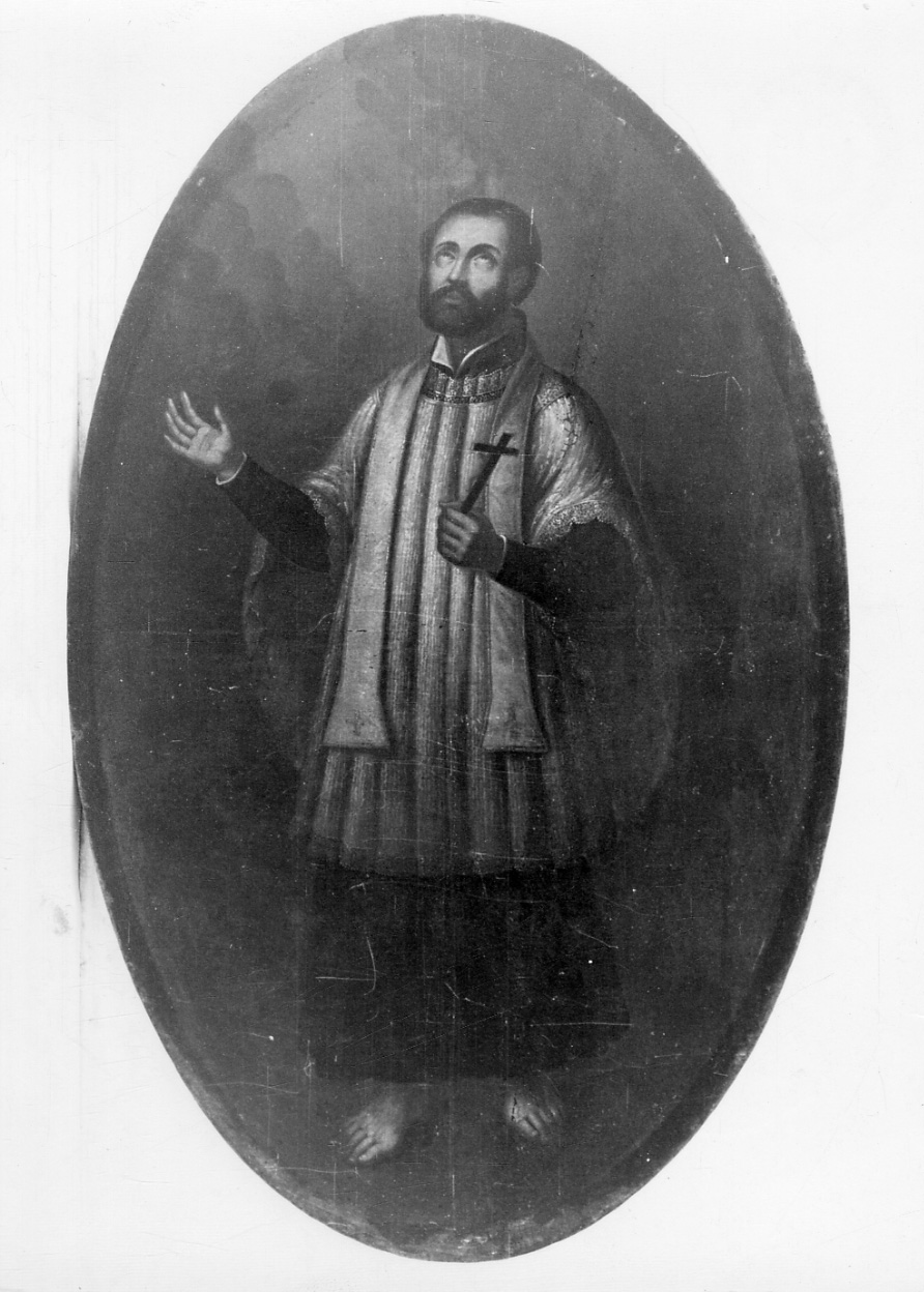 Il santo, con lo sguardo rivolto verso il cielo delimitato da nuvole, allarga le braccia quasi ad accogliere la volontà divina. E' a piedi nudi e indossa la veste cerimoniale per la messa