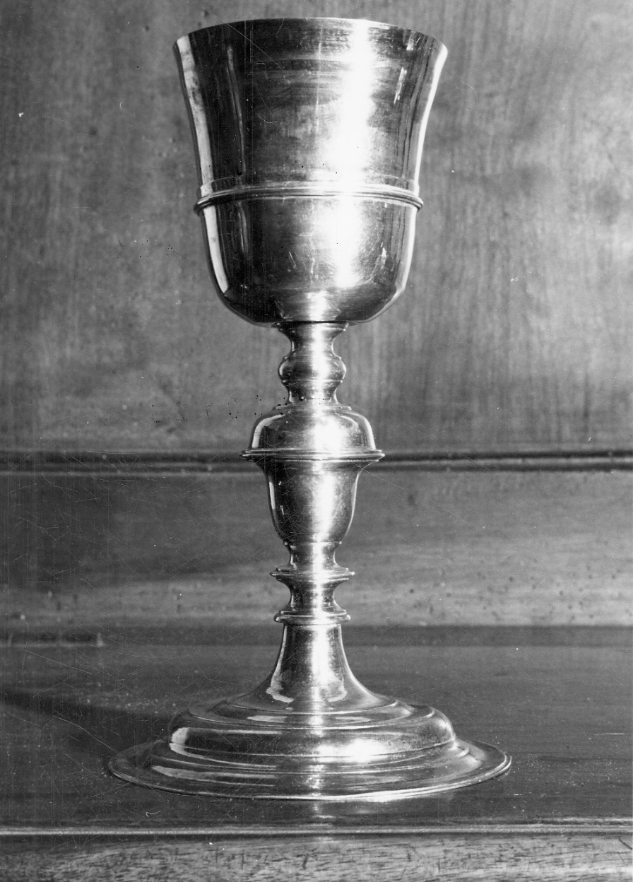Calice in argento con base percorsa da sottili cornici e scanalature orizzontali, fusto con impugnatura a nodo, a tronco di piramide. Il sottocoppa svitabile, al cui interno è presente il punzone dell'argentiere, è decorato con una leggera fascia a rilievo vicino alla coppa