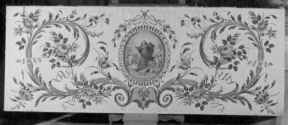Paliotto con fondo di seta marezzata créme, ricamo in filo d'oro filato su anima di pergamena, sete policrome, ciniglia, applicazione di paillettes e paillettes punzonate. Grandi girali laterali si incontrano sotto al medaglione centrale