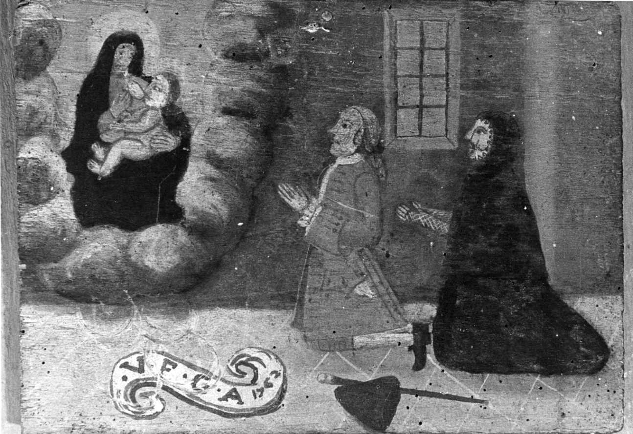 Un uomo in abiti settecenteschi gialli intensi e una donna in abito nero sono in ginocchio di fronte alla Madonna con Bambino in un ambiente giallo marrone. In baaso a sinistra vi è un cartiglio bianco con iscrizione nera. Il dipinto è senza cornice
