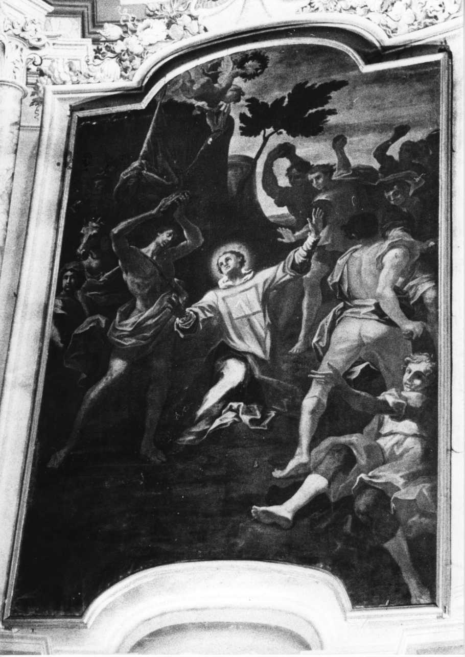 Il dipinto, posto dietro l'altar maggiore, si distingue dagli altri perchè racchiuso entro cornice mistilinea dorata. Raffigura la lapidazione del martire. Al centro della scena il santo, inginocchiato a terra con le braccia levate e aureola intorno al capo (veste bianca e tunica violetta) al suo fianco il carnefice ignudo con drappo grigio molto mosso, di spalle un uomo con brache rosse e manto blu. La figura che mostra la scena è in veste bianca con mantello giallo. La scena si svolge all'aperto, sullo sfondo del cielo azzurro profili di dirupi e alberi, terreno marrone scuro