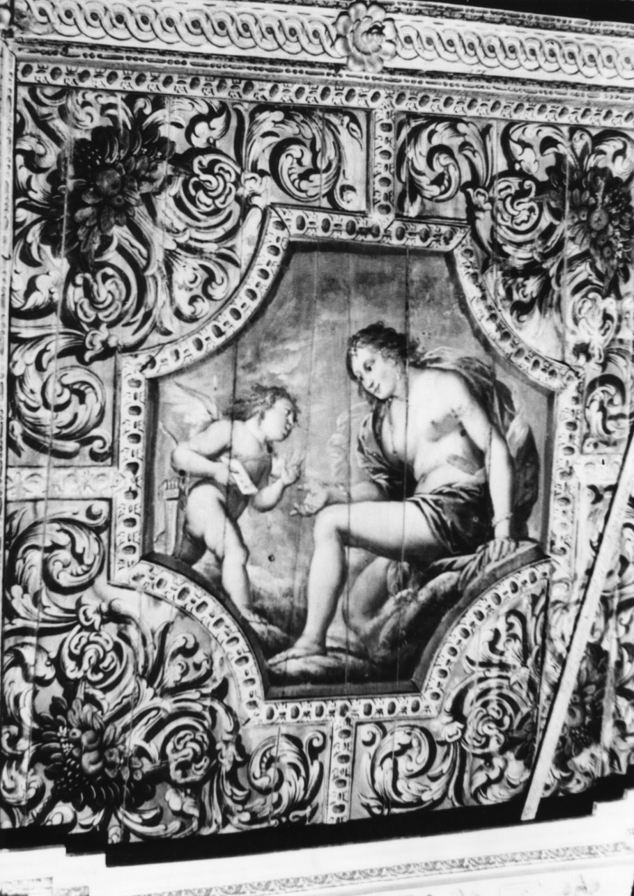 - NOTIZIE STORICO CRITICHE Nell'inventario del 1776 il complesso viene attribuito a Tanzio da Varallo (Descrizione dei quadri del Castello di Masserano, Ms. Storia Patria 295, Biblioteca Reale di Torino). Successivamente però Debernardi rifiuta questa attribuzione e, notando le affintà stilistiche con gli affreschi della chiesa di San Gaudenzio di Novara, lo ritiene opera del Fiamminghino, ovvero, G.M. della Rovere (DEBERNARDI FERRERO D., Il castello dei Principi Ferrero Fieschi di Masserano, in Bollettino S.P.A.B.A., anno XII/ XIII, 1958 - 1959, pp. 9 - 10). La Debernardi considera il soffitto opera dello stesso autore del fregio con i segni zodiacali, considerando le differenze di tensione compositiva dovute solo alla diversa tecnica, cioè affresco e legno. Alcuni anni dopo Debiaggi, pur accettando l'ipotesi di un unico autore per i due complessi, li attribuisce a Gianoli, spostandone l'esecuzione fra il 1655 e il 1660, soprattutto in base all'affinità stilistica coi primi affreschi del Sacro Monte di Varallo e con quelli del Battistero di Novara, cui Gianoli lavorò in quegli anni (Debiaggi C., I dipinti di P.F. Gianoli nel palazzo Ferrero Fieschi di Masserano, in Biella, gennaio 1963, pp. 9 - 10). Anche se mancano documenti probatori che possano chiudere la polemica sull'attribuzione, si può concordare con quanto afferma Debiaggi, proprio per la comune matrice culturale composita che lega, negli stessi anni, le opere di Masserano e quelle di Novara. Nel complesso la foga pittorica che sottolinea il vigoroso taglio compositivo, dato forse il carattere aulico, appare più controllata rispetto alle dodici tabelle coi segni zodiacali. Dipinta con pennellata lieve e vivace, la scena mitologica rivela il gusto più profondo di Gianoli, improntato a una briosa caratterizzazione dei personaggi e a una facile cromatismo.Nell'inverno 1978 il soffitto è stato sottoposto a pulitura e rinfrescatura dei colori dal restauratore Guido Nicola