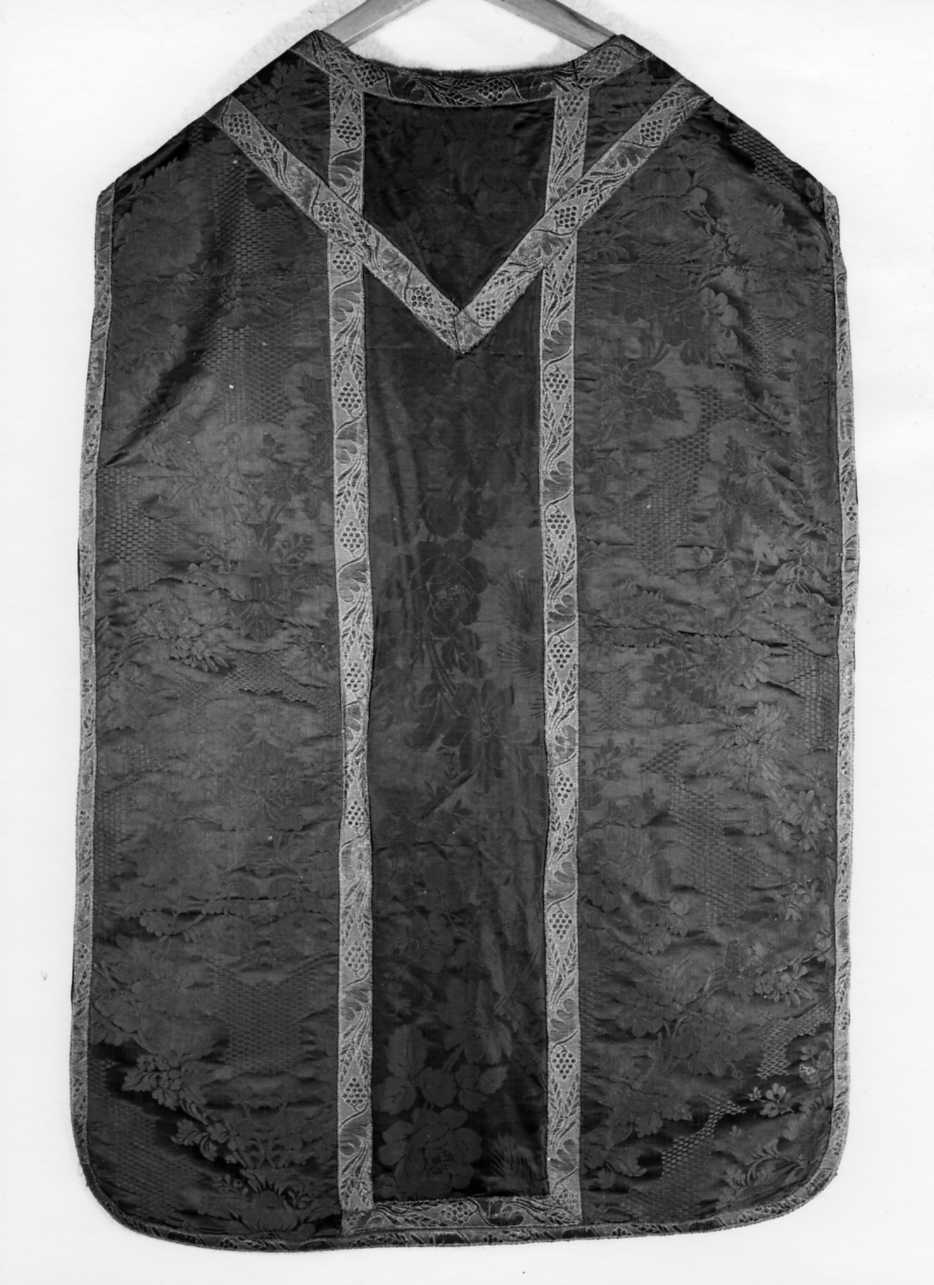 La pianeta è cucita con due diversi tipi di tessuto. Ai lati è un damasco a fondo raso con disegno legato taffetà a forte rilievo costituito da meandri intrallaciati, a sviluppo verticale, di rami con fiori e foglie. Gli spazi tra questi sono occupati da figure a contorni frastagliati, compite da una quadrettatura. La colonna è in damasco raso con disegno taffetà. Il disegno è visibile solo in parte, ma è riconoscibile come del tipo di meandri a rami di rosa, a simmetria speculare, tra i quali sono mazzi di spighe. Gallone tessuto in oro filato e giallo