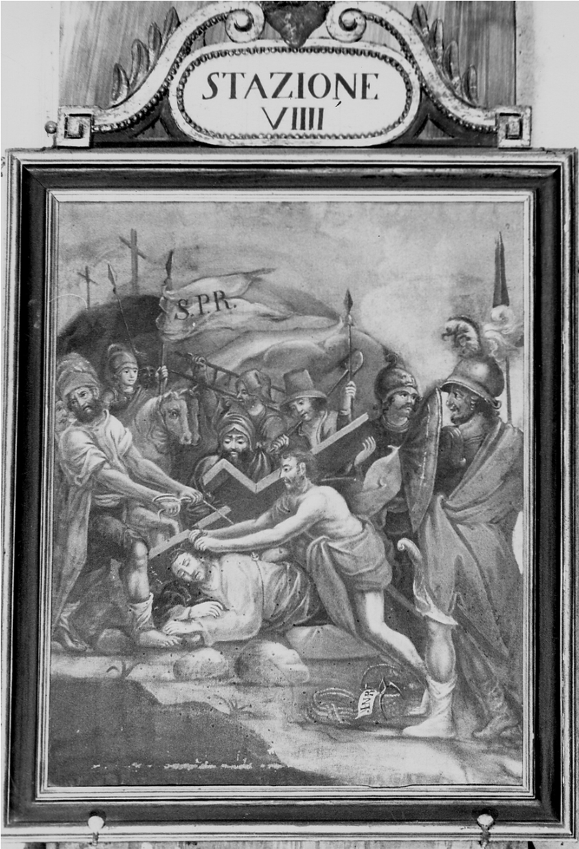 - NOTIZIE STORICO CRITICHE Non sono state reperite indicazioni né di carattere bibliografico sulla serie in esame. Una lettera conservata presso l'Archivio Parrocchiale di Livorno Ferraris, ora difficilmente reperibile, documenta l'opera al 1822 e la fa supporre opera del pittore luganese Domenico Cattaneo (comunicazione orale di G. F. Giuliano), attivo nella parrocchiale anche per una pala rappresentante la Pietà che rivela, analogamente alla serie in esame, una cultura figurativa accademica con stilemi neoclassici