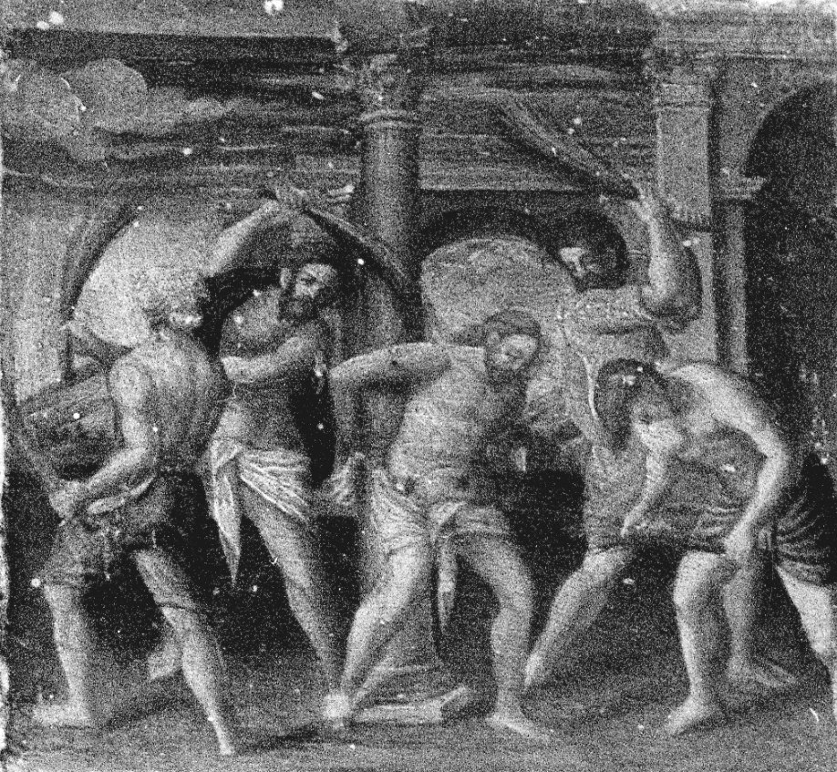 Al centro, in primo piano, è Cristo legato alla colonna, con capitello corinzio, e falgellato da quattro sgerri. Il fondo è definito da archi a tutto sesto