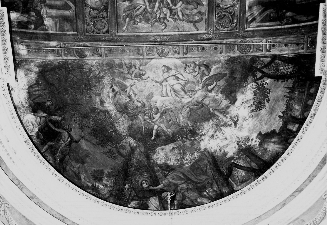 - NOTIZIE STORICO CRITICHE LA decorazione della volta del presbiterio e del coro è attribuita concordemente dalle fonti a Giovanni Mauro della Rovere detto il Fiamminghino, la cui esecuzione è avvenuta probabilmente negli stessi anni in cui il pittore attendeva alla decorazione della cappella della Beata Vergine del Rosario. Il Frasconi indica, per la realizzazione di questi affreschi, la data 1637, senza citare nessun documento a sostegno (Novara, Archivio di Stato, fondo Museo, 239, C. FRASCONI, Chiese, Conventi, monasteri stati soppressi in Novara sul principio del sec. XIX, p. 105). La stessa data è ripresa dal Tarella che riferisce come l'oprea sia stata commessa "dai militi o cavalieri di S. Pietro MArtire ad incitamento del Padre Gregorio Oroboni Inquisitore per la Fede" (Novara, Archivio di Stato, fondo Museo, carte Rusconi, cart. 291, R. TARELLA, La Chiesa del Rosario in Novara, p. 7). Pittore milanese, affine alle esperienze pittoriche del Morazzone e dei Procaccini, il Fiammenghino è autore, con il fratello G. Battisti degli affreschi ai Sacri Monti di Varallo e di Orta, realizzati negli anni 1608, 1615. Nella decorazione della volta del presbiterio in esame, il pittore porta a Novara l'espressine di quella cultura pietistica che caratterizzò la pittura della controriforma lombarda, riscontrabile nella disposizione teatrale delle figure, nell'attenzione ai gesti e alle espressini dei personaggi, nella serrata costruzione degli ambienti,. già proposta nella raffigurazione dei Sacri Monti. Un primo restauro è gia indicato nel 1726, anno in cui vennero "rinfrescate" ed "aggiustate" tute le pitture della Chiesa (Novara Sacra, Almanacco bisestile per l'anno 1840, p. 129). Indicazioni più precise si riferiscono ai restauri ottocenteschi effettuati dal Riva e dal Narducci, indicati dal Cassani con la data 1827 e 1830 (L'Avvisatore, 1913; Il Risveglio, 1929, n. 9, p. 121)., nei documenti d'archivio e su un cartiglio del putto dipinto sulla vela con la data 1837 (Novara, Archivio del Sacro monte di Pietà, cart. 73, Culto - Chiesa di S. Pietro al Rosario. Opere diverse). L'ultimo intervento si è avuto nel 1930 ad opera del Sig. Boccalari e del prof Gino Bardella sotto il controllo della Soprintendenza: in questa occasione furono eseguiti la lavatura degli affreschi, il rifacimento delle parti mancanti con colorazione più intonata "per far rivivere e rinnovare dove mancasse l'antica decorazione" (Il Risveglio, 1930, n. 2, p. 51; Il Risveglio, 1930, n. 9, p. 142; Novara, Archivio del Sacro monte di Pietà, cart. 216, Chiesa Parrocchiale di S. Pietro al Rosario; G. BARLASSINA, A. PICCONI, Le chiese di Novara, Novara 1933, p. 126). Per la bibliografia si veda anche L. A. COTTA, Aggiunta al museo novarese, Milano 1701, p. 280; F. A. BIANCHINI, Le cose rimarchevoli della città di Novara, Novara 1828, pp. 66-67; Il Risveglio, 1929, n. 2, p. 54; N. R. CESARE, Arte e artisti del 600 nella chiesa del Rosario, estratto dal B.S.P.N., anno XXV, 1931; G. BARLASSINA, A. PICCONI, Le chiese di Novara, Novara 1933, pp. 123, 127; A. RIZZI, Conoscere Novara entro i baluardi, Novara 1947; Novara, Archivio del Sacro monte di Pietà, cart. 72, Culto - Chiesa di S. Pietro al Rosario. Opere diverse; Novara, Archivio del Sacro monte di Pietà, cart. 216, Chiesa Parrocchiale di S. Pietro al Rosario. La scena in esame appare confrontabile, pedr la disposizione delle figure e l'abbigliamento dei personaggi, isolati sullo sfondo, nel quale la luminosità di un'alba o di un tramonto illumina le mura della città, i profili delle colline e gli intrichi della selva in primo piano, al "bacio del lebbroso" eseguito, unitamente al fratello G. Battista, nella cappella del Sacro Monte di Orta fra il 1608 e il 1615