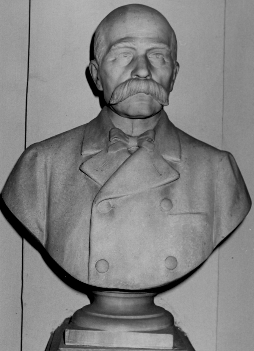 Ritratto di Carlo Meynardi. Il personaggio indossa un soprabito doppiopetto abbottonato, che lascia appena intravedere il fiocco della cravatta. Parzialmente calvo, porta folti baffi. La scritta sulla base del busto è di colore nero
