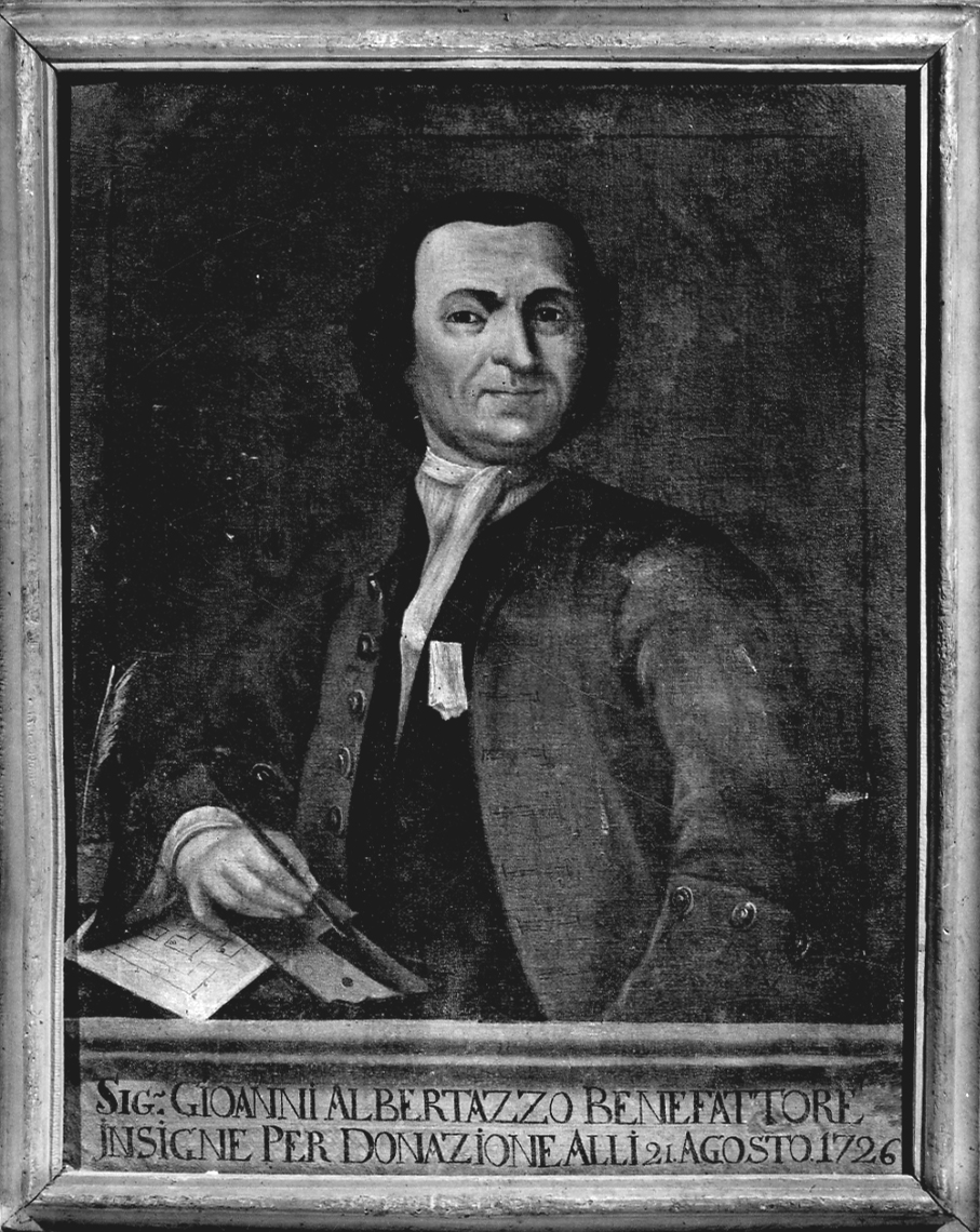 - ISCRIZIONI sul recto, in basso, entro cartella - SIG. GIOANNI ALBERTAZZO BENEFATTORE/ INSIGNE PER DONAZIONE ALLI 21 AGOSTO 172 - lettere capitali - a pennello -