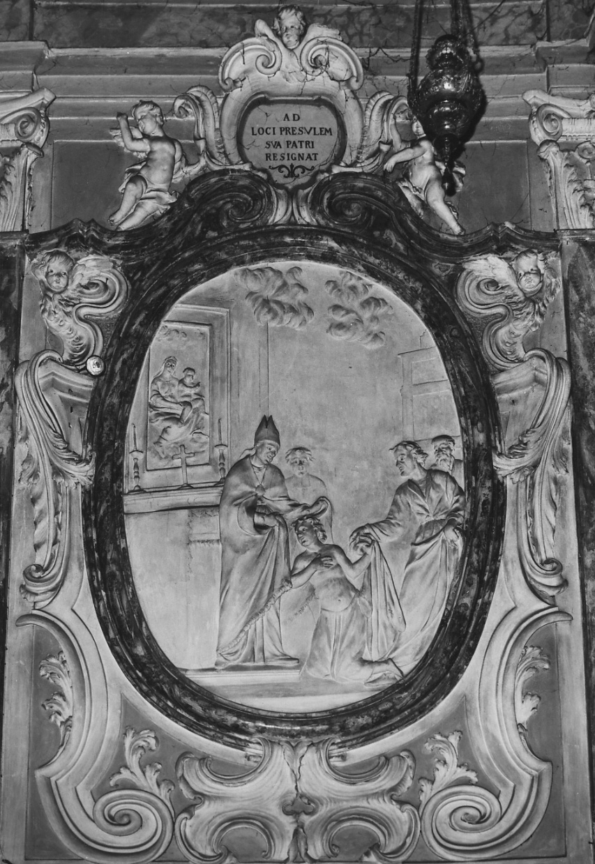 Entro cornici ovali marmorizzate di colore rosso-bruno, con parti marmorizzate e cera con ferro caldo, a sua volta contornate da decorazioni mistilinee e fitomorfe in stucco bianco, sono raffigurati quattro episodi della vita di S. Francesco. Sopra ogni incorniciatura, poggiante alle estremità su due cherubini, si trova un fastigio costituito da due putti adagiati sulle volute e reggenti un cartiglio sormontato da un cherubino; al centro di ogni cartiglio è un motto tratto dalla Bibbia. L'incorniciatra è analoga a quella delle due finestre del coro. Gli episodi rappresentati sono San Francesco d'Assisi morente ha la visione dell'angelo che suona il violino; sulla parete sinistra del presbiterio; S. Francesco predica al lupo, nel coro sulla parete sinistra; il vescovo ricopre col propio manto S. Francesco, davanti, nel coro, a destra, sulla parete sinistra; le Stigmate di S. Francesco, nel presbiterio, parete destra