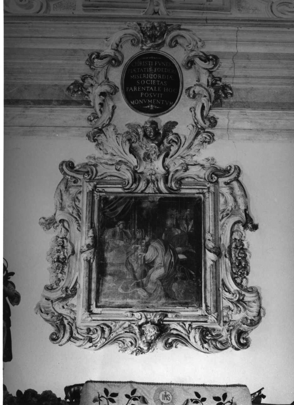 - ISCRIZIONI in alto, entro cartiiglio - CHRISTI FUNERI,/ PIAETATIS FOEDERE/ MISERICORDIAE/ SOCIETAS/ PARENTADE HOC/ POSUIT/ MONUMENTUM - lettere capitali -