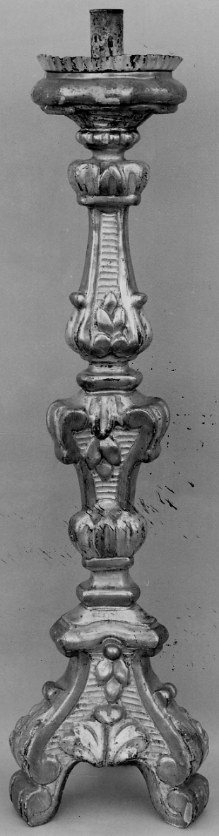 - NOTIZIE STORICO CRITICHE La serie di candelieri presenta una fattura ordinaria, ma non priva di eleganza nella forma e nella scelta degli elementi decorativi semplici e sobri; analoghi ad altre serie conservate nella stessa chiesa (cfr. 0100031300, 0100031301, 0100031303, 0100031305, 0100031306), essi rappresentano una tipologia ampiamente diffusa e facilmente reperibile nell'arredo sacro di molte chiese piemontesi (cfr. A. Midana, L'arte del legno in in Piemonte nel 600 e 700, Torino, 1925, figg. 438-439). Gli esemplari in esame possono essere ricondotti ad una datazione nel secondo terzo del XVIII secolo e ad una produzione di ambito piemontese. Due candelieri si trovano attualmente sull'altare della quarta cappella a sinistra. Questi ultimi sono stati ridorati e riargentati, probabilmente, alla fine dell'Ottocento