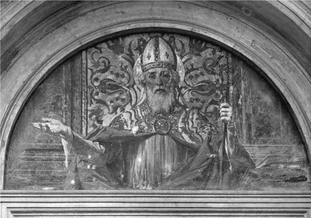 La lunetta mostra in primo piano la figura di S. Agostino, con la mitra in capo e il pastorale nella mano sinistra, in ricche vesti ecclesiastiche. Il santo è dipinto a mezzo busto, in posizione frontale, su un fondale simulante un drappo ornato a racemi