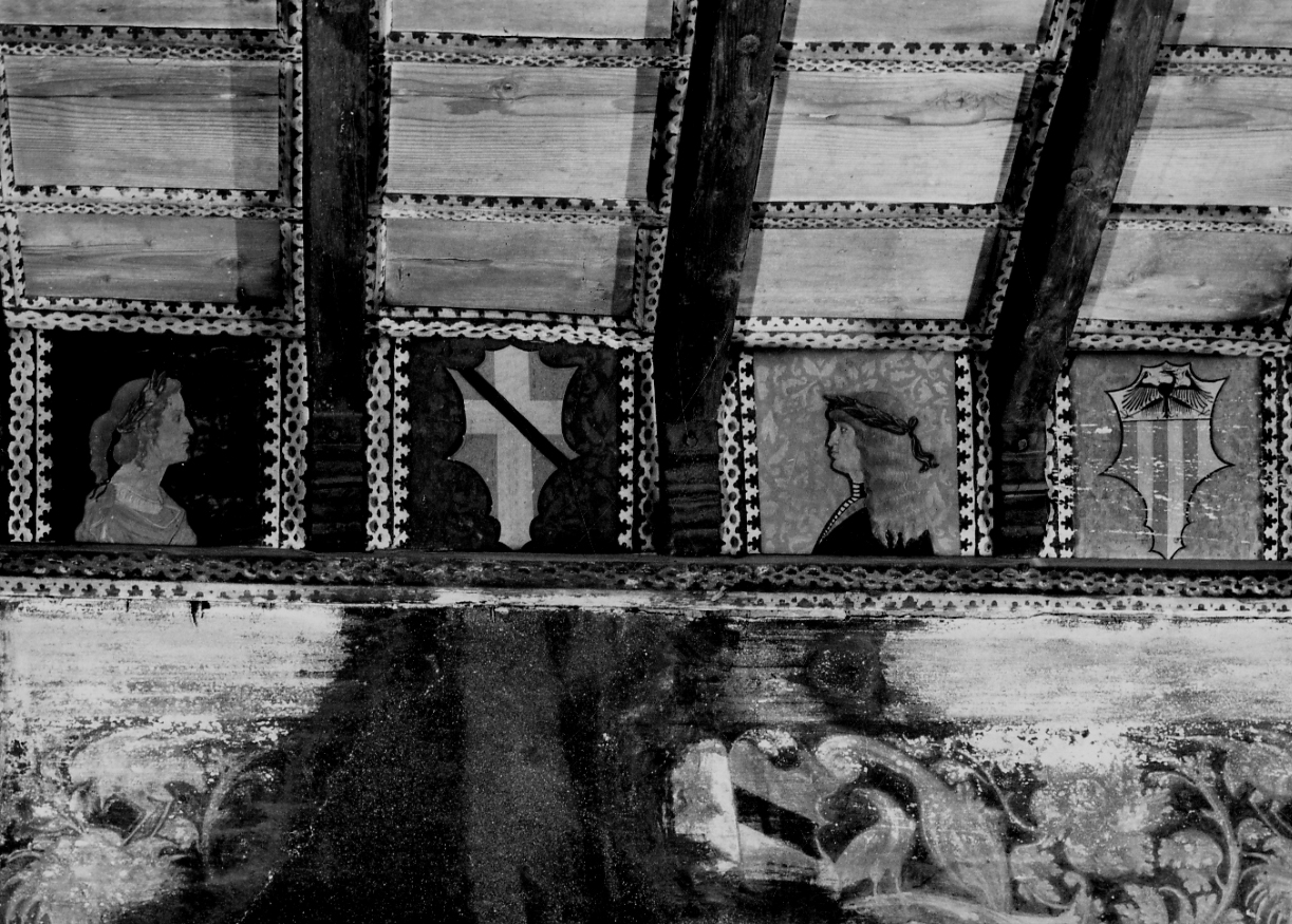 - NOTIZIE STORICO CRITICHE Le due schiere di 12 riquadri del terzo ambiente esaminate in questa scheda rappresentano un rinnovamento e arricchimento e per certi versi una rottura degli schemi e dei soggetti riscontrati negli ambienti precedenti. Anzitutto viene a cadere la successione dei soggetti ripetuti in maniera monotona secondo lo schema simmetrico: vaso ornamentale, stemma nobiliare, figura a mezzo busto, stemma, figura, due stemmi, figura, stemma, figura, stemma e per finire vaso ornamentale. La successione dei soggetti in queste due schiere diventa assolutamente casuale, salvo il fatto che alla figura di un uomo si accompagna al secondo riquadro una figura femminile. in termini di soggetti scompaiono i ricchi vasi ornamentali visti in precedenza, sostituiti da motivi altrettanto elaborati ma più genericamente decorativi, non altrettanto interpretabili in termini di contenuti formali. Altra novità è la comparsa di soggetti di contenuto mitologico, la cui ventata classicheggiante si riflette anche sull'abbigliamento di certi personaggi raffigurati: non più ricchi e sfarzosi abiti rinascimentali, ma semplici tuniche avvolte sulle spalle, rigide armature metalliche, capelli avvolti in candide fasce, chiaramente ispirate ai modelli di abbigliamento dell'antichità classica. Altra novità è l'arricchimento delle modalità di rappresentazione delle figure a mezzo busto: ai personaggi riprodotti di profilo si accompagnano per la prima volta figure viste da tre quarti ed addirittura di fronte. A questi elementi che già di per sé contribuiscono a rendere più vario ed originale lo schema decorativo del terzo ambiente rispetto i primi due, va aggiiunto un disegno molto più ricco ed una resa cromatica assai più vivace della cornice contornante le tavole di raccordo tra travi e soffitto, nonchè i pannelli del soffitto tra le piccole tavole di orditura. La decorazione del terzo ambiente si può quindi attribuire a maestranze diverse e di epoca successiva, quando si erano ormai esauriti gli schemi ed i soggetti dei primi ambienti