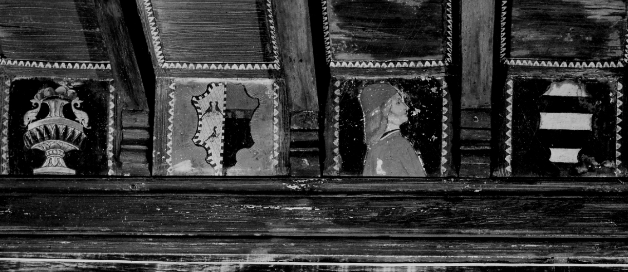 Le 24 tavolette divise in due schiere di 12 attraversano la sala del secondo ambiente rispettivamente lungo la prima trave lato opposto l'ingresso e la seconda trave prospiciente l'ingresso. Le 12 tavolette poste lungo la prima trave lato opposto l'ingresso da sinistra a destra comprendono: 1) elemento architettonico a foggia di vaso 2) stemma: partito semi-spaccato, d'oro a tre gazze al naturale, due ed una, le superiori affrontate, con la bordatura composta d'argento e di nero; troncato di rosso e di nero 3) figura di uomo su fondo nero in abito e berretto rosso cardinalizio 4) stemma: fasciato di nero e d'argento. Appartenente ai Conti Alciati di Vercelli 5) figura di donna su fondo rosso damascato in ricco abito nero e biondo, i capelli stretti alla nuca da una cuffia bianca, come ornamento un girocollo nero ed una lunga collana bianca 6) stemma: scaccato d'argento e di rosso, col capo cucito del primo all'aquila di nero coronata dello stesso 7) stemma: di nero al decusse ancorato d'azzurro, accantonato da quattro gigli d'argento. Appartenente ai Conti Arborio di Vercelli 8) figura di uomo su fondo rosso damascato in tunica marrone, il capo cinto da corona d'alloro 9) stemma: di rosso alla croce d'argento, al filetto sul tutto in sbarra di nero 10) VEDI ANNOTAZIONI