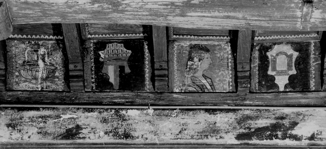 Le 24 tavolette divise in due schiere di 12 attraversano la sala del primo ambiente rispettivamente all'altezza della terza trave portante lato opposto l'ingresso e sopra l'arco in muratura che delimita il primo ambiente. Le 12 tavolette sulla terza trave lato opposto l'ingresso da sinistra a destra comprendono: 1) elemento architettonico a foggia di vaso 2) stemma: troncato di rosso e di nero 3) figura di uomo su fondo nero in abito rosso e verde, capelli biondi, il capo cinto da una corona di alloro 4) stemma: fasciato di rosso e d'argento col capo cucito di rosso all'aquila d'oro coronata dello stesso e palo nero centrale 5) figura di giovane donna su fondo rosso damascato in veste azzurra e bianca con cappello nero e lunghi capelli biondi 6) stemma: di rosso alla croce d'argento. Appartenente ai Conti di Savoia 7) stemma: d'oro a tre gazze al naturale, due ed una, le superiori affrontate, con la bordatura composta d'argento e di nero. Appartenente alla famiglia Ajazza di Vercelli 8) figura di giovane donna su fondo verde scuro damascato abbigliata di una veste bianca, i capelli legati alla nuca da una lunga fascia rossa ricadente sulle spalle VAI AD ANNOTAZIONI