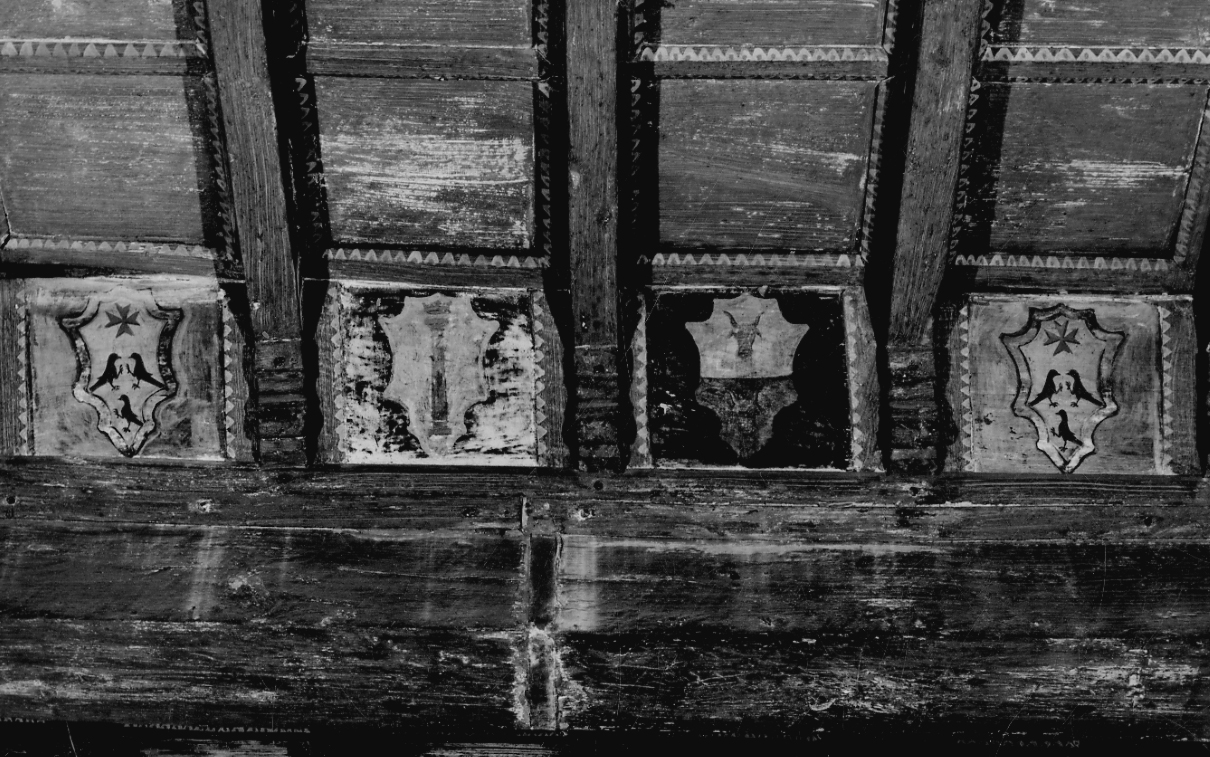 Lo stemma della famiglia Ajazza dipinto nel primo e quarto riquadro, si presenta: "d'oro a tre gazze al naturale, due ed una, le superiori affrontate e sovrastate da croce di Malta, con la bordatura composta d'argento e di nero". Nel secondo riquadro lo stemma della famiglia Colonna: "di rosso alla colonna d'argento coronata d'oro". Nel terzo riquadro lo stemma della famiglia Bobba: "troncato di rosso e d'argento al riscontro di bue dell'uno nell'altro (A. Franchi Verney, 1873, pp. 2-26-55). Lo stemma nobiliare della famiglia vercellese Ajazza, edificatrice ed antica proprietaria del Palazzo che costituisce l'attuale asilo Filippi, si ripete per ben 19 volte (sia singolarmente che semipartito con stemmi di altre nobili famiglie) lungo i riquadri dipinti sulle assicelle di accordo tra le travi principali ed il soffitto dei tre ambienti. Più precisamente: nel primo ambiente 1 trave " 4°, 7° e 9° riquadro lato opposto l'ingresso 2 trave " 5° e 8° riquadro lato prospiciente l'ingresso 2 trave 4°, 7° e ° riquadro lato opposto l'ingresso 3 trave 6° riquadro lato opposto l'ingresso Nel secondo ambiente Arco d'ingresso 4° e 9° riquadro 1 trave 4° riquadro lato prospiciente l'ingresso 1 trave 11° riquadro lato opposto l'ingresso 2 trave SEGUE IN ANNOTAZIONI