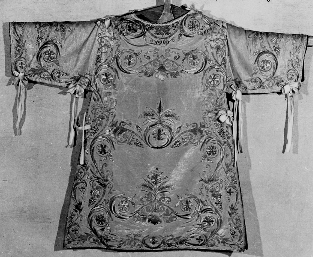 Paramento liturgico composto da una pianeta, due tunicelle, un piviale, un velo omerale, due stole, un velo di calice e una borsa di corporale. Armatura: Gros de Tours laminato in argento, ricamato. Fondo avorio. Ricamo realizzato con oro filato, oro riccio e lamellare su imbottitura di cartoncino, fili e tela, con applicazioni di lustrini e canutiglia. Tralci con foglie lanceolate si arricciano in volute terminanti con un fiorellino stilizzato a sei petali. Un secondo motivo, consistente in rami di vite con pampini, grappoli e viticci si intreccia con il primo. Sono presenti inoltre motivi ad arabesco e spighe di grano stilizzate. Fodera in taffetas rosso