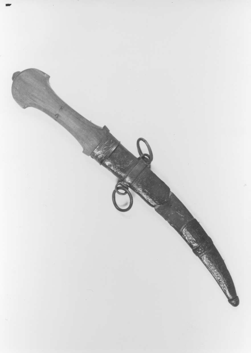 - NOTIZIE STORICO CRITICHE Il manufatto ha una lama leggermente ricurva, un'impugnatura lignea e un fodero anch'esso in legno, rivestito con cuoio ed elementi metallici in lega di rame. La decorazione della lama è simile a quelle che interessano il rivestimento del fodero, con motivi geometrici incisi. Completano il fodero due anelli, utilizzati in origine per legare una cintura al portatore. Sul retro dell'oggetto e sui lati sono ben visibili saldature in stagno, molto debordanti, che fanno supporre una passata riparazione o sostituzione di alcune parti. Il pugnale è riconducibile alla tipologia cosiddetta koummya, in uso tra le popolazioni berbere e arabe che vivevano in Marocco