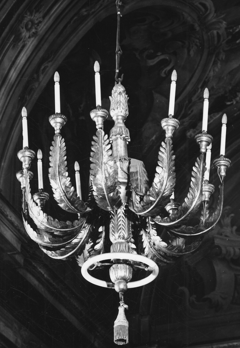 - NOTIZIE STORICO CRITICHE Notizie varie piuttosto frammentarie si conservano in archivio sull'acquisto di "lustri" (lampadario). Ci sembra tuttavia attinente una nota del 24/2/1839 affermante la necessità di altri due lustri simili a quelli a "18 chiari", per completare l'apparato. Ad essa si deve certamente riferire l'opera presente, che può così essere datata alla prima metà del secolo XIX. L'aspetto stilistico, a parte il minor numero di bracci, è in tutto simile tra le due serie. Sino a pochi anni orsono l'insieme dei 5 lampadari ri trovava riunito nel presbiterio. (cfr. N. Gabrielli, "Arte e cultura ad Asti attraverso i secoli", Istituto Bancario S. Paolo, Torino 1977, p. 183)