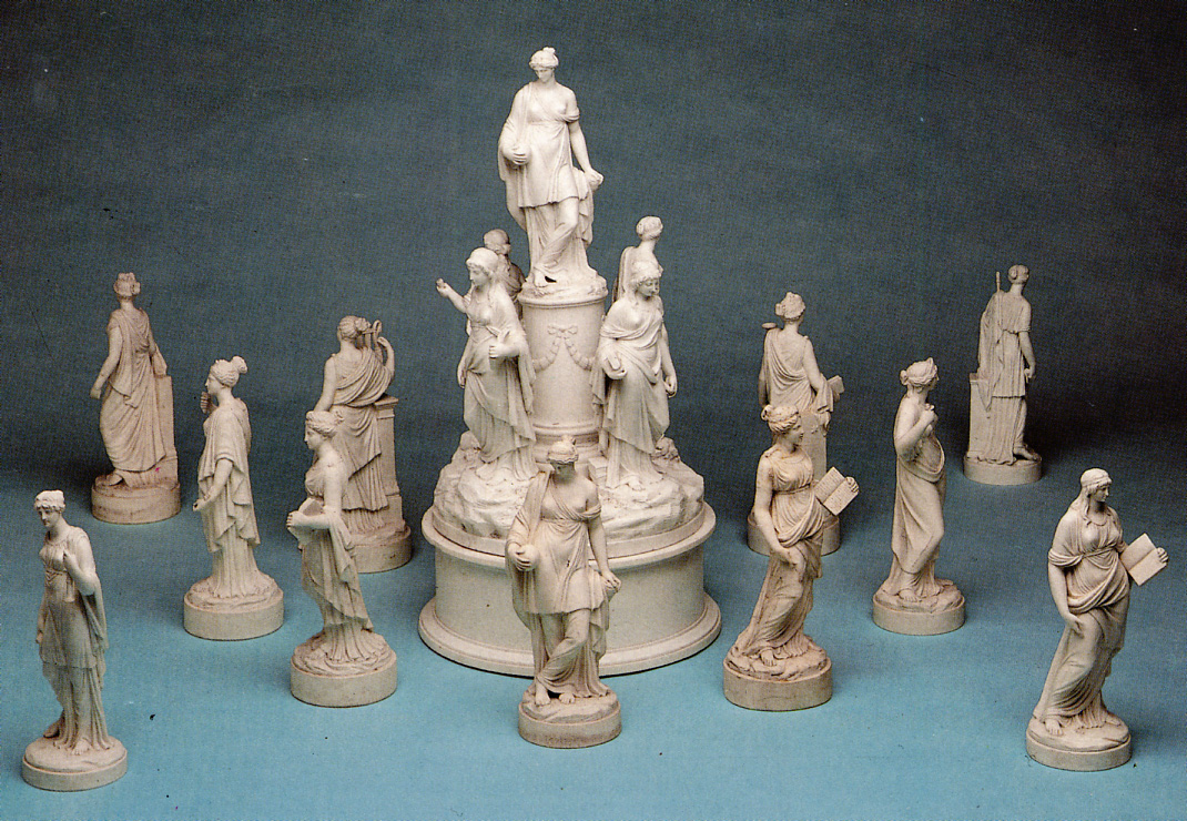 Gruppo scultoreo per centrotavola composto da un gruppo centrale e da dodici statuette: esemplari ripetuti da due a quattro volte delle Muse Urania, Calliope, Erato, Clio, Euterpe, Melpomene, ciascuna con i suoi attributi caratterizzanti, per un totale di sedici elementi ripartiti in due anelli concentrici ad altezza progressivamente decrescente rispetto alla figura centrale di Urania, che si eleva su di un alto piedestallo con base e decorazioni a festoni