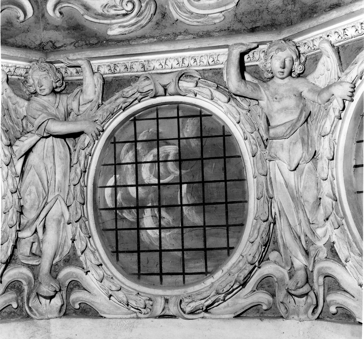 Nel tamburo, entro cornici di stucco, serie di 8 finte finestre ovali, con grata e sfondato di nubi