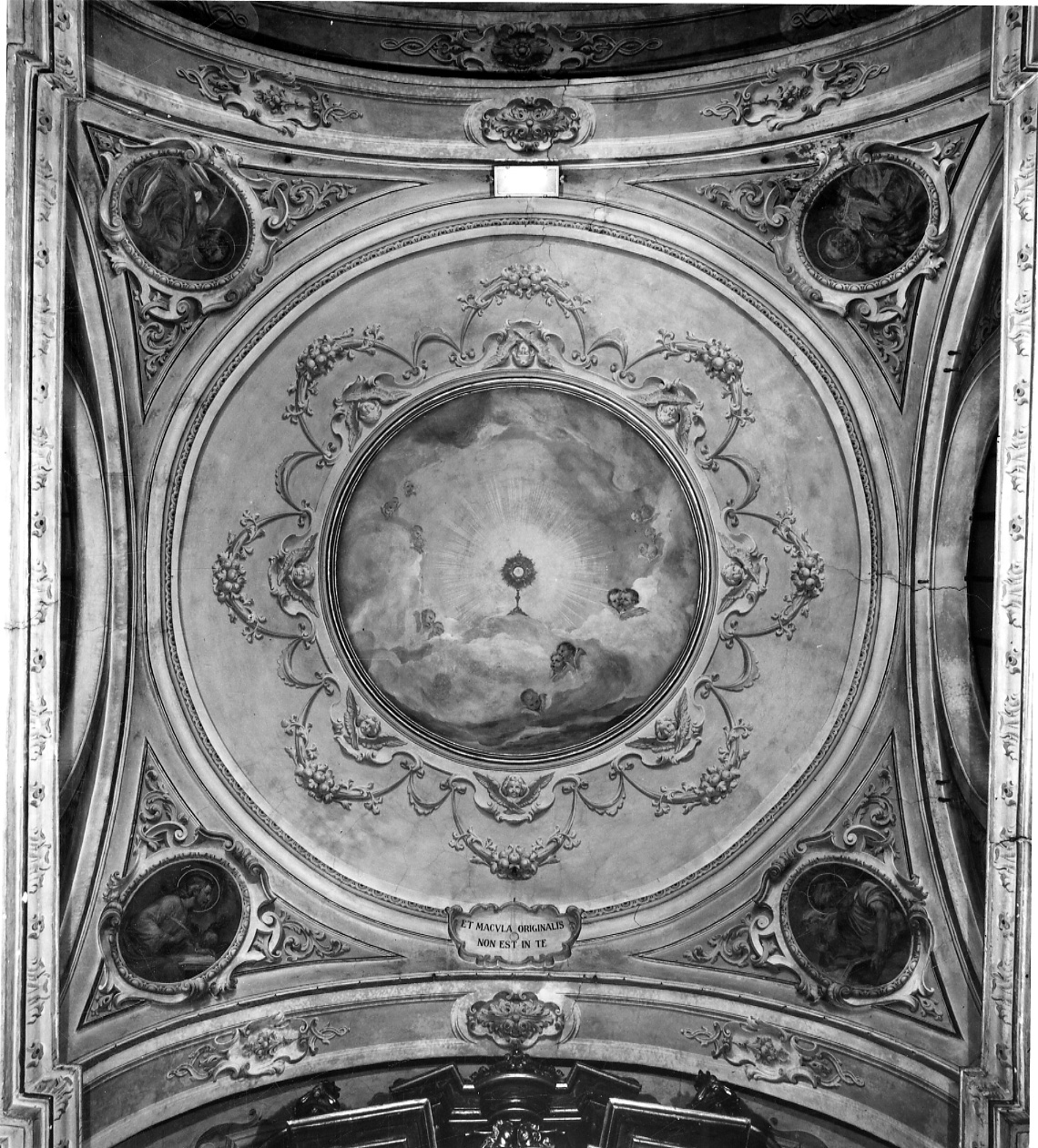 La volta del presbiterio è a botte, e gli affreschi sono stati concepiti per dare l'illusione di una cupola con un grande occhio centrale aperto verso il cielo. Si tratta di un cielo inteso in senso mistico: un ostensorio dorato recante il SS. sacramento brilla tra le nuvole e piccole teste di cherubi si perdono in lontanza. Il grande oculo è incorniciato da teste cherubiche con festoni di frutta e foglie resi con i tono del giallo, bianco e grigio, che vengono riproposti negli elementi decorativi dei sottarchi e nel motivo a palmette del cornicione laterale. Nei 4 pennacchi (azzurri) entro cartelle ovali figurano gli Evangelisti. Ai lati della volta sono state realizzate su fondo rosato due finte finestre a semicerchio con grata