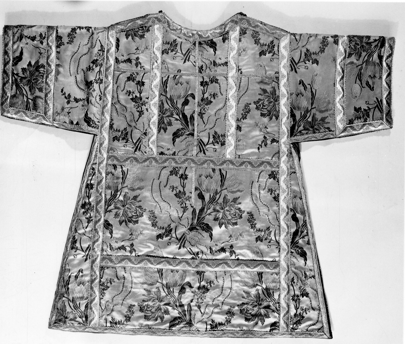 Il motivo decorativo presenta lo svolgersi in ampie ondulazioni di un nastro serpeggiante. Ad intervalli regolari, il nastro trattiene con un fiocco un grande mazzo con peonia rosso scuro e tre tulipani gialli, rivolto ora a destra ora a sinistra. Il disegno è complicato dallo snodarsi un pò più rigido di un tralcio con rami fioriti insieme al nastro. Tessuto: fondo in raso avorio e disegno ottenuto per slegatura di trame verdi lanciate e di trame broccate (?) a varie tonalità di giallo, rosso e beige. La tunicella presenta un tessuto recente in raso: disegno a tralci ondulati con rose, spighe, uva e un motivo a trina. E'foderata con seta marezzata magenta ed è decorata da 2 galloni (3,5 e 1,5 cm), tessuti in seta gialla e fili d'oro, con un motivo a festone ondulato nelle cui anse è una foglia stilizzata
