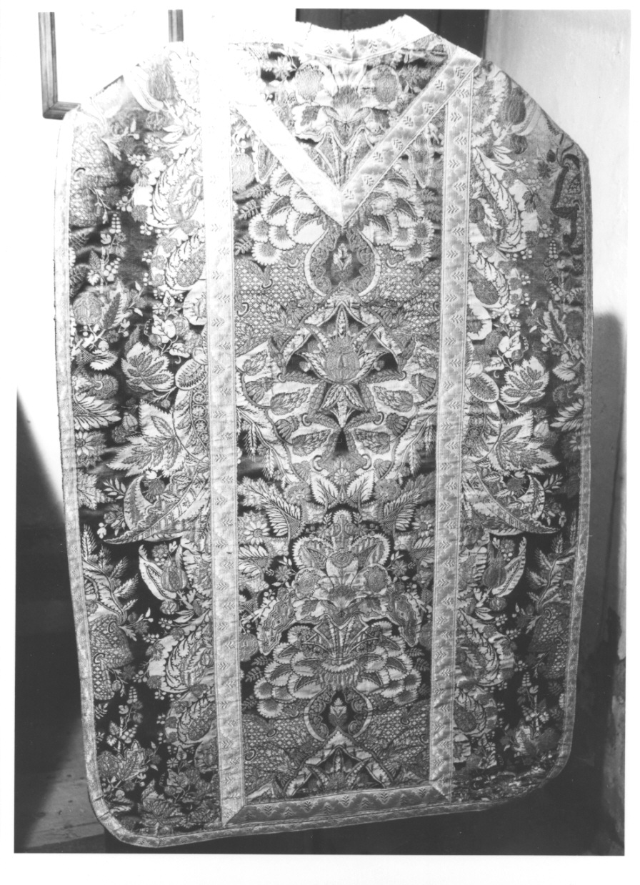 Pianeta in lampasso verde, su un fondo di raso rosa con disegno a trame lanciate in argento, filo rosa e filo color ruggine. Trame broccate in argento filato. Gallone argentato. Fodera di taffetas verde. Il motivo decorativo è composto da una grande sequenza continua di decori vegetali a foglie, frutti, spighe e cespi fogliacei che sbocciano da vasi