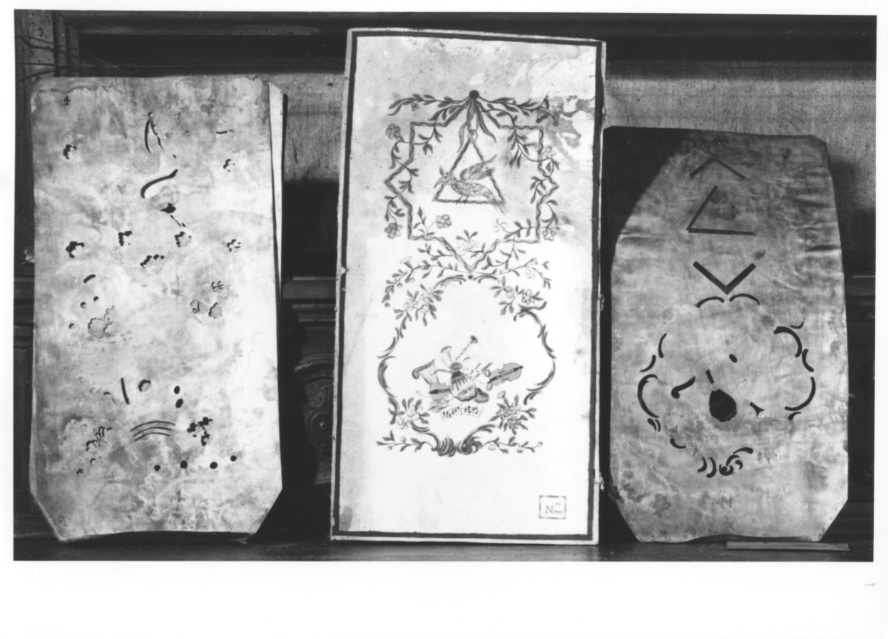 lama metallica traforata con motivi a cornici mistilinee con elementi vegetali: in una entro triangolo un uccello di fantasia, nell'altra un trofeo di strumenti musicali. Le lamine sono poste entro busta di carta dipinta con cornice nera ed al centro il possibile risultato della stampa con la matrice: cornici rosa con tralci di fiori rosa e verde, uccello in rosa, natura morta di strumenti musicali in rosa e giallo