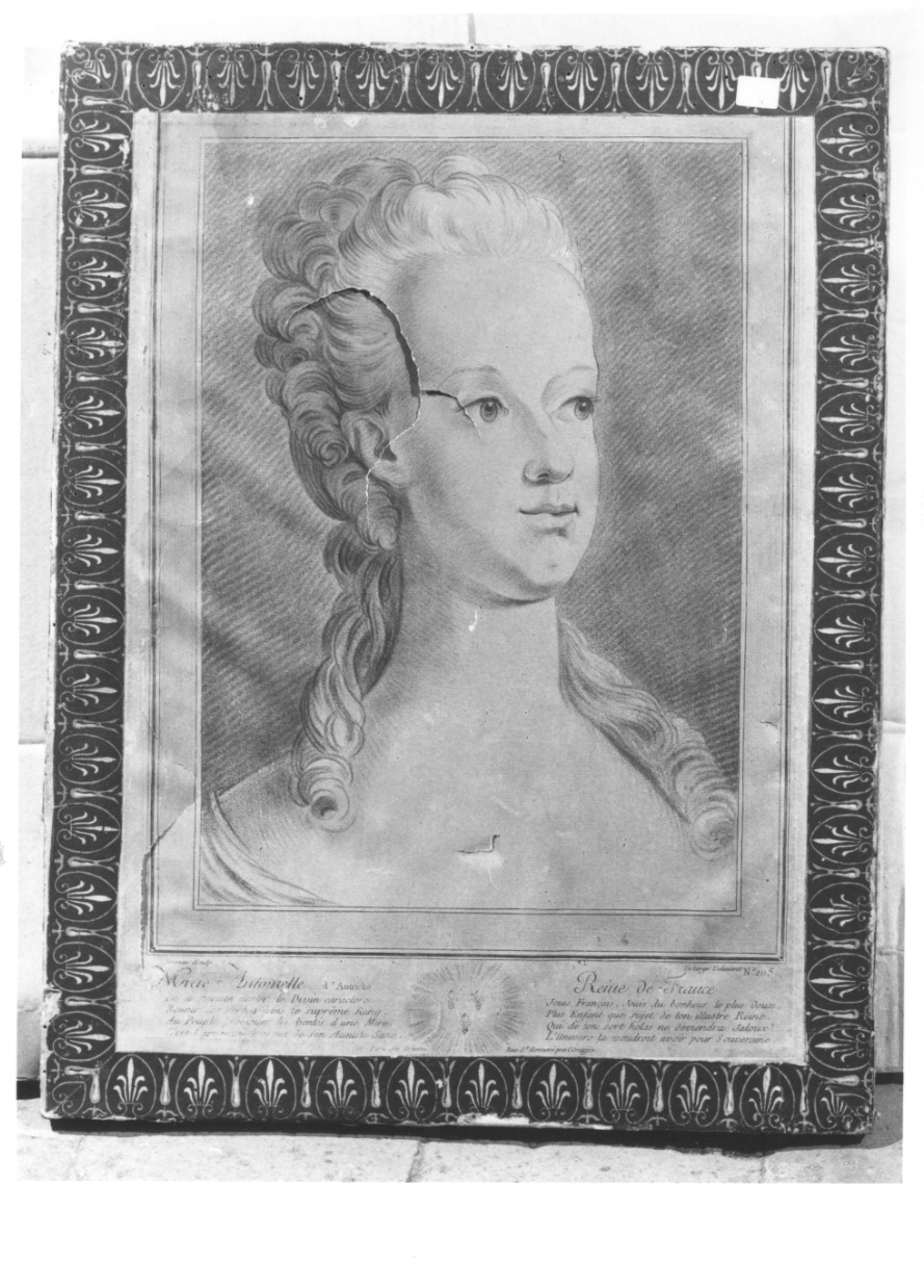 - ISCRIZIONI in basso - Marie Antoinette d'Autriche Reine de France/ De sa Beauté porter le Divin caractère/ Reunir le Vertus... le supreme rang,/ Au Peuple... les bontés d'une mère,/ C'est [...] de son August Sang// Jouis Francais, jouis du bonheur le plus doux,/ Plus Enfant que sujet de ton illustre Reine,/ qui de ton sort helas ne reviendra Jaloux/ L'Univers la voudroit avoir pour Souveraine - corsivo -