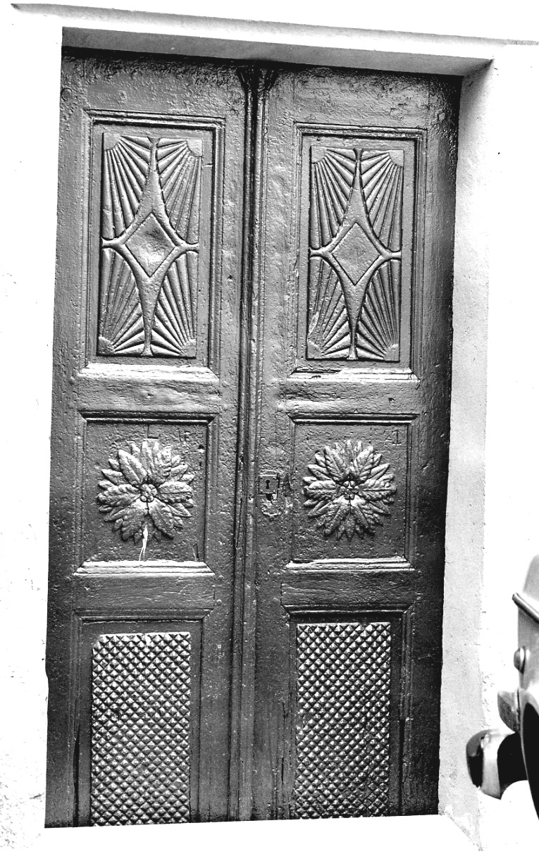 Porta a due battenti definiti da sei specchiature riquadrate, racchiudenti quattro fiori stilizzati nei pannelli superiori e due fiori di girasole in quelli mediani. I pannelli inferiori sono definiti da motivi a punta di diamante