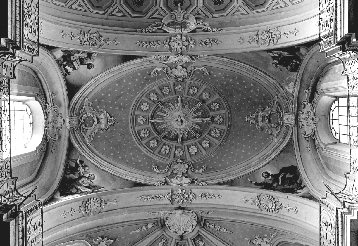 Cupola ovale con cornice e ornamenti in stucco. Tempera azzurra con stelle gialle, colomba dello Spirito Santo al centro, pennacchi coi quattro Evangelisti