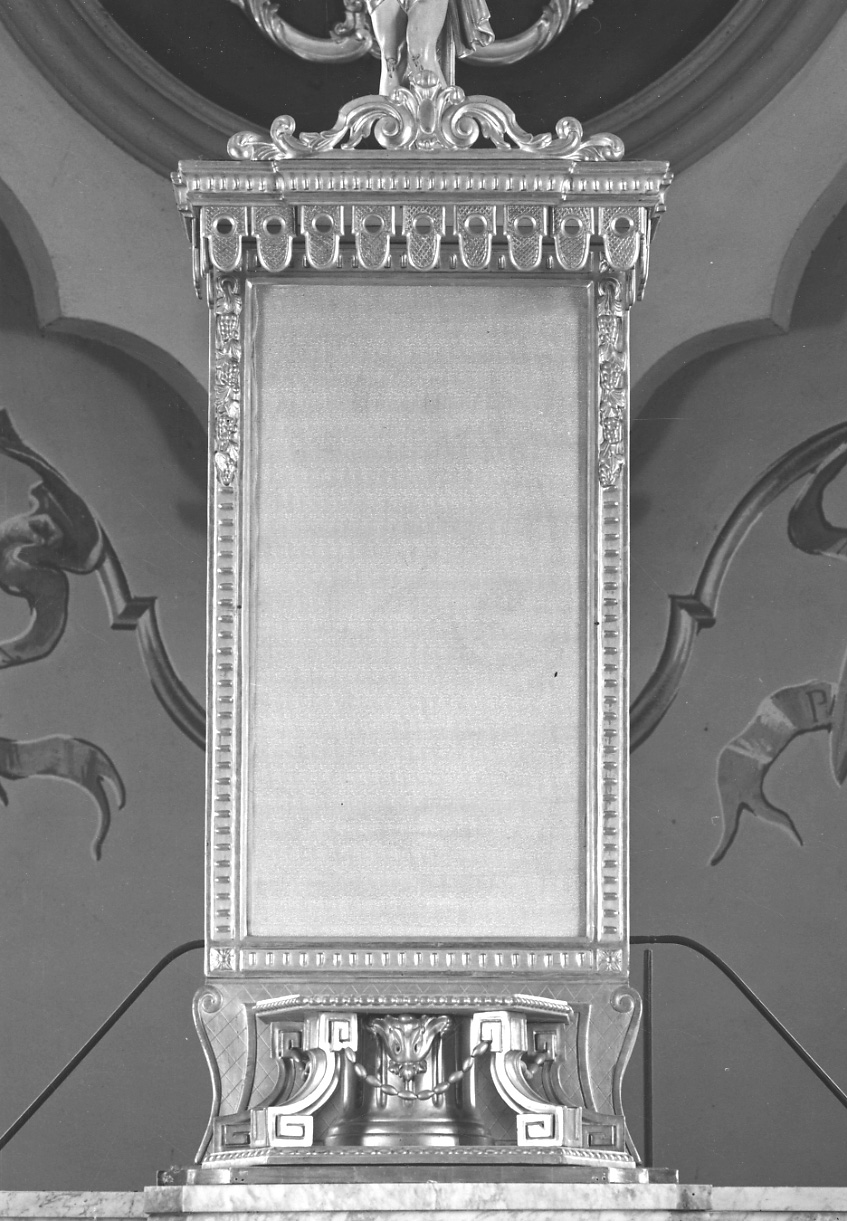 Base costituita da quattro coppie do greche collegate da un festone di ovoli che racchiudono al centro la base di una colonna scanalata decorata da un motivo fogliato a rilievo sul fronte. Fascia di perline sullo zoccolo e lungo la superficie d'appoggio. Postergale: cornice scanalata con quattro rosette angolari; ghirlanda pendula con foglie e grappoli di uva lungo i lati. Drappellone con lambrecchini intagliati a grata e traforo circolare. Fastigio con due volute affrontate che racchiudono una palmetta. Stoffa di recente fattura nel postergale e nel cielo