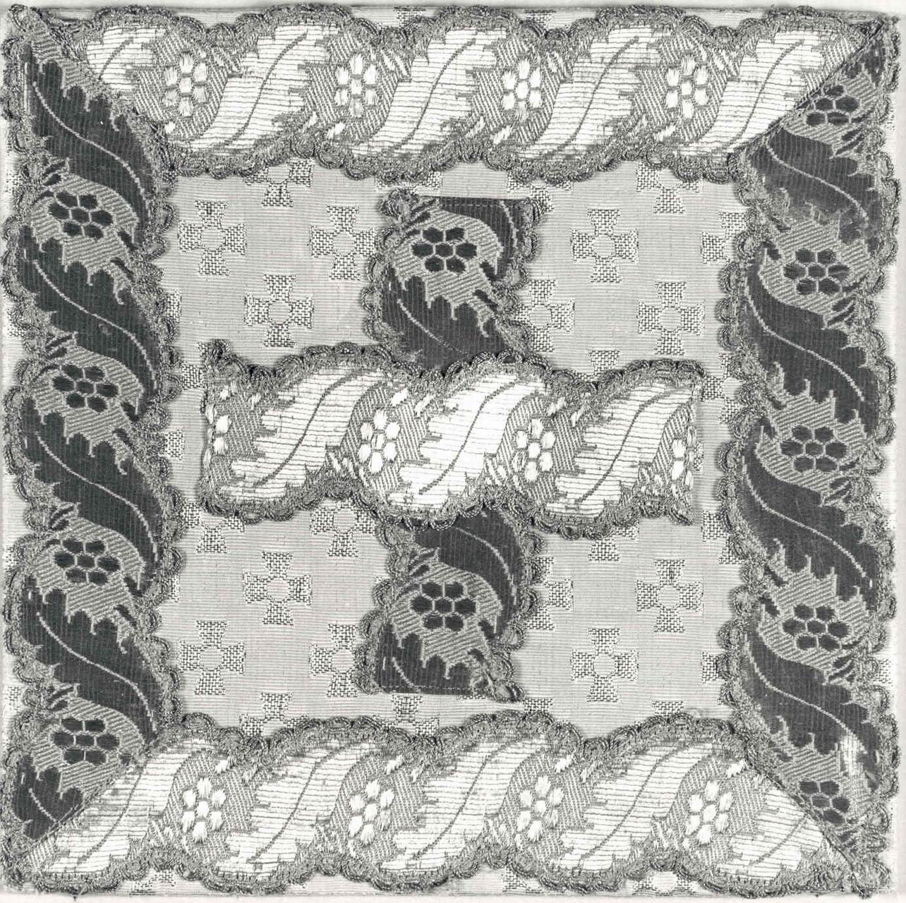 La borsa è confezionata con un pannello di gros laminato lanciato ed è foderata con un pannello di taffettas marezzato. Lungo i bordi è stato applicato il gallone, impiegato anche per realizzare la croce posta al centro, con entrambi i bordi smerlati rifiniti da un motivo a giorno in oro, impreziosito da piccole margherite giustapposte a sinuose foglie di quercia, entrambe dorate, che si stagliano sullo sfondo argentato. La tasca è realizzata con tela di lino bianca