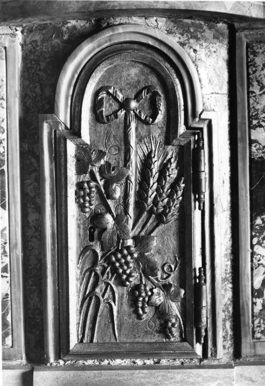 Intagliato sul lato anteriore con tralci di vite con grappoli e spighe di grano trattenute da un nastro annodato in alto