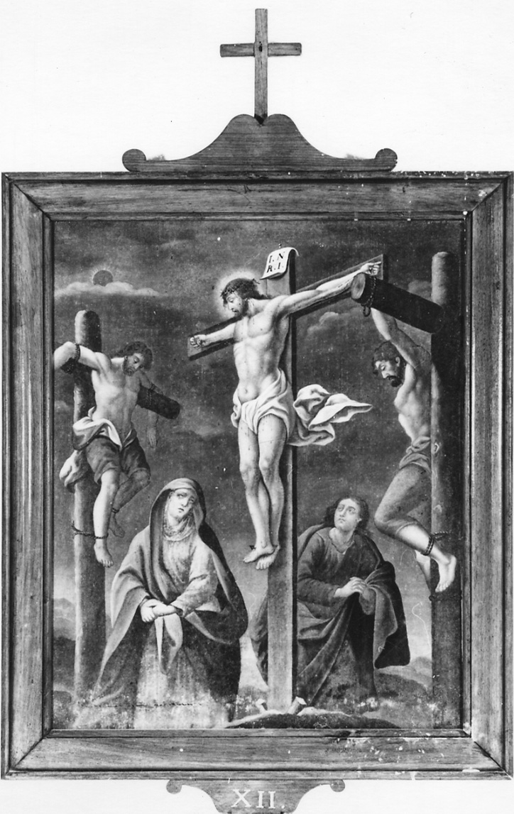 Cristo inchiodato alla croce viene compianto dalla Vergine e fda San Giovanni, rispettivamente raffigurati sulla deatra e sulla sinistra. I due ladroni sono raffigurati alle estremità della composizione