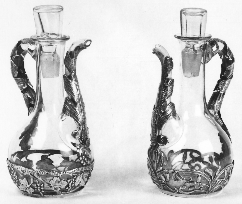 Due ampolline a brocca con versatoio. Decorazione: tralci d'uva, volute fogliate