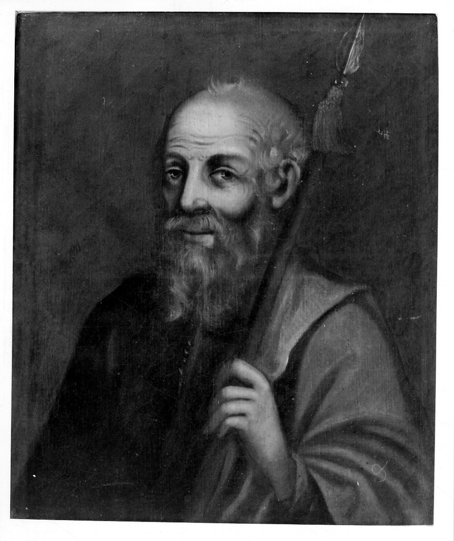 dipinto raffigurante SanTommaso a mezza figura con il busto ruotato verso sinistra, il volto di tre quarti, con la lancia nella mano destra, la barba e i capelli bianchi su sfondo scuro