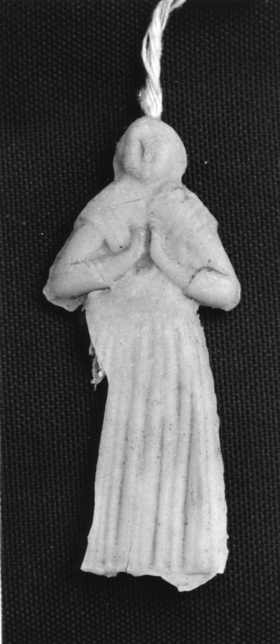 La cera è lavorata a stampo; raffigura una donna, in piedi a mano giunte, mentre prega