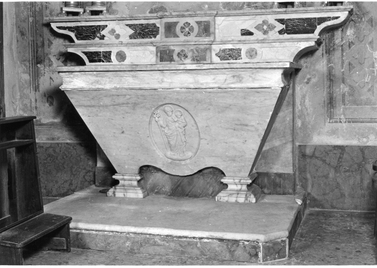 Altare a due gradini, paliotto a urna su piedi a mensola. Decorazione: figura di San Giuseppe nel paliotto; motivi geometrici sui gradini