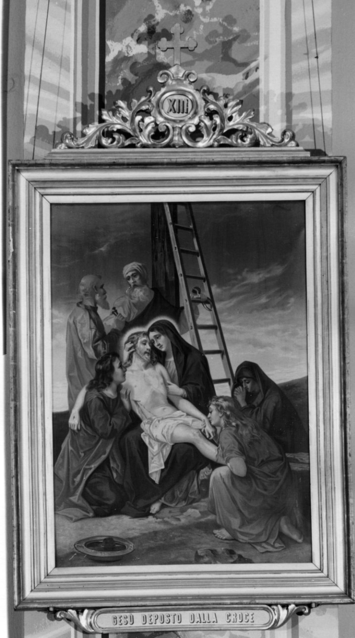Cristo, deposto dalla croce, viene accolto sulle ginocchia della Madre piangente, accanto, Maria Maddalena e due pie donne; sullo sfondo, a sinistra, Nicodemo e Giuseppe d'Arimatea