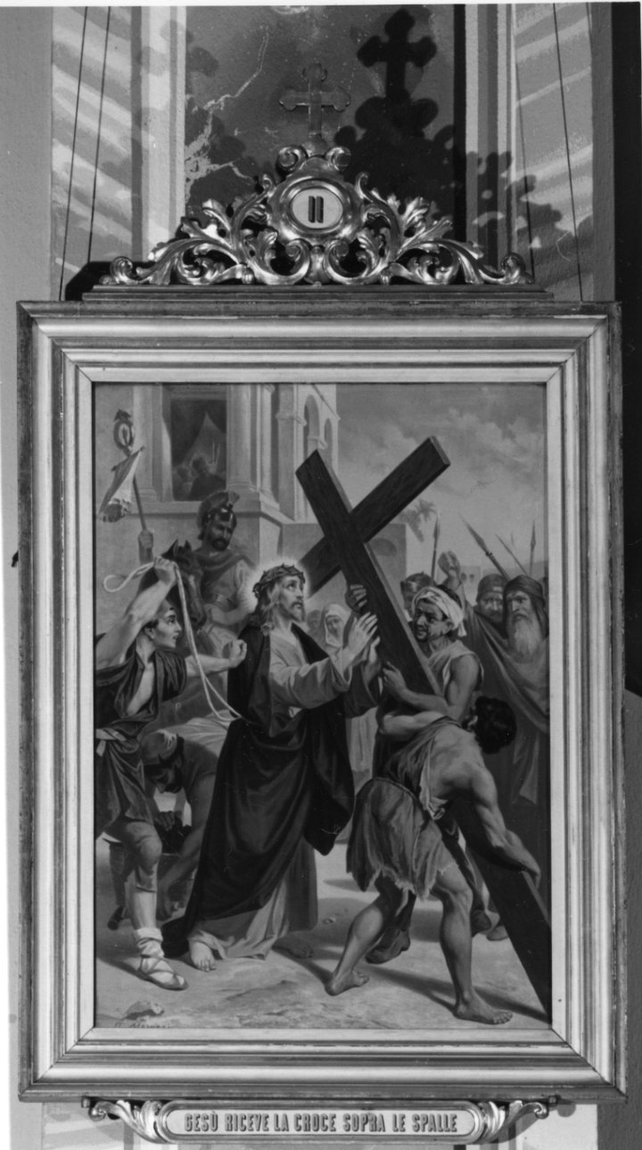 Cristo, già incoronato con le spine, viene caricato della croce dai carnefici