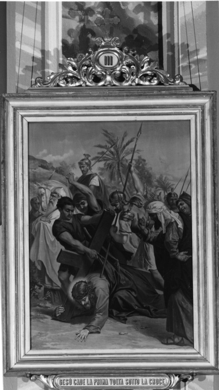 Cristo cade la prima volta sotto il peso della croce, rimanendo a terra disteso; i carnefici lo incitano ad alzarsi